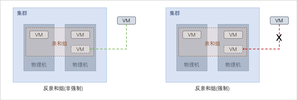 - 反亲和组强制策略的一组云主机,可手动迁移至同一台物理机,且手动迁移后不会在根据亲和组策略自动迁移 。